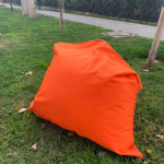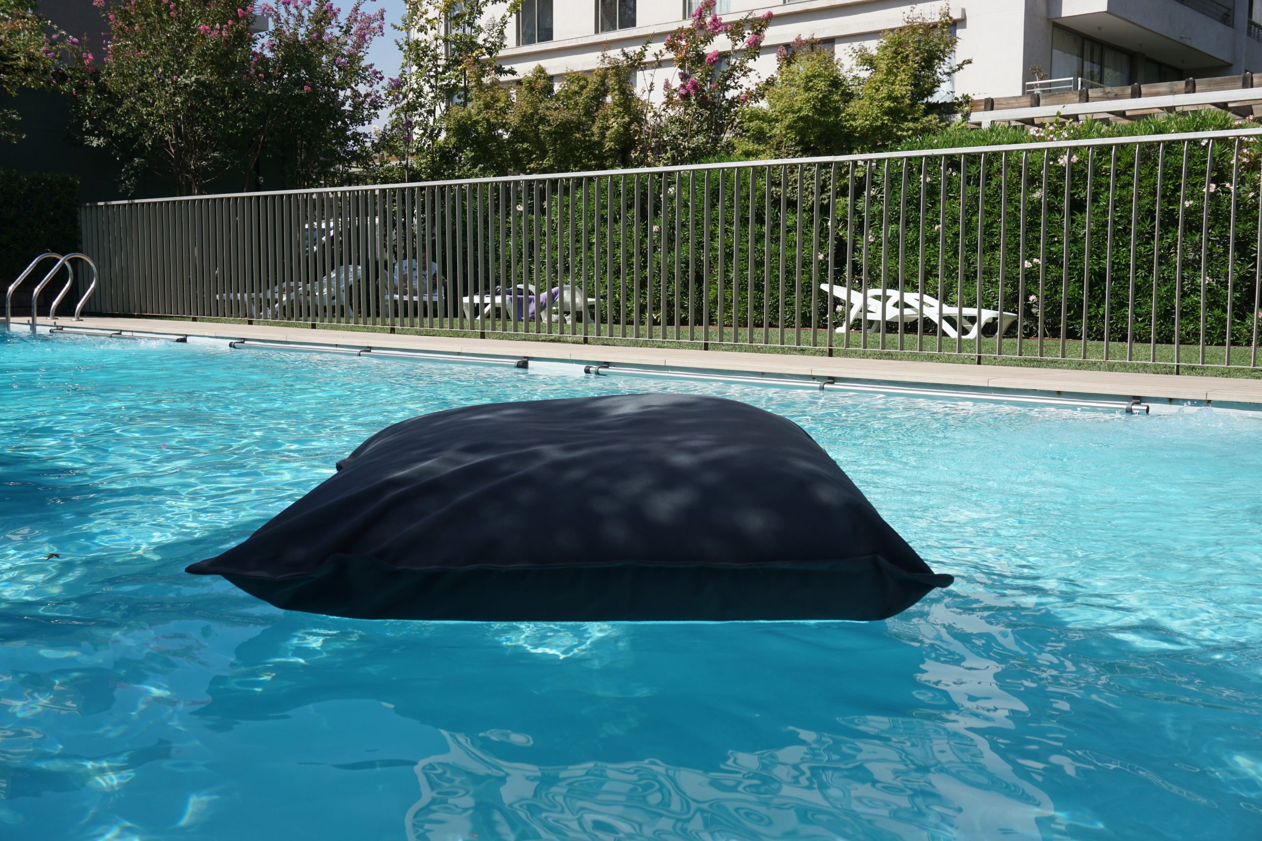 Cojín de 120 x 120 cm relleno de pelotas de poliestireno en tela de lona impermeable con filtro UV con cierre para lavado y funda pongee. Con pestaña de 5 cm de largo.